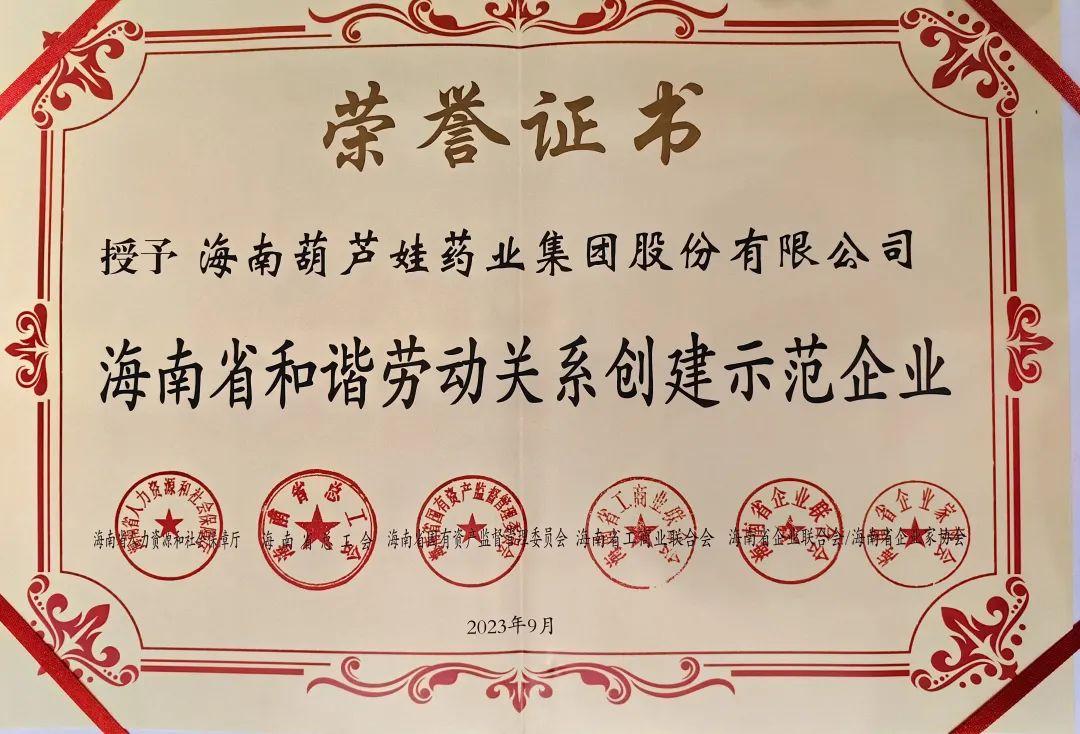 利来w66药业集团获评“海南省和谐劳动关系创建示范企业”